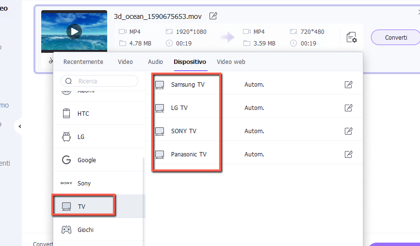 Adesso, sulla destra del programma clicca sull’icona evidenziata al punto 3 nella figura sopra, per far aprire il menu con tutti i formati supportati. Vai nella sezione dei formati video popolari e scegli DIVX come formato di uscita. Scegliendo questo formato sarai certo di ottenere in uscita un file video in formato .AVI con codifica DivX, e quindi sarà sicuramente riproducibile e visualizzabile sulla TV. Oppure se vuoi riprodurre il video sulla tua TV, accedi alla scheda Dispositivo e poi seleziona TV dalla sinistra. Potrai infine scegliere la marca della tua TV