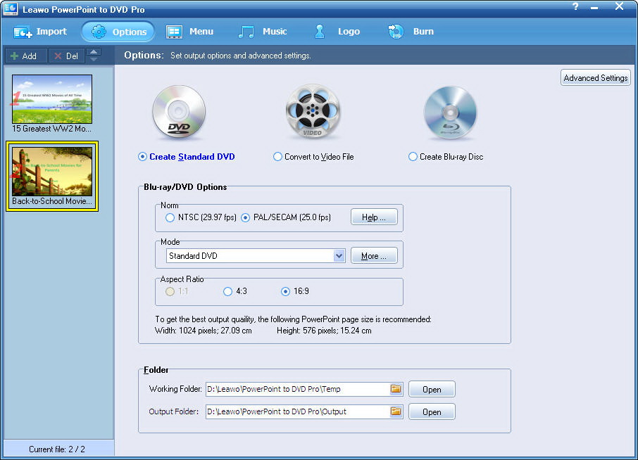 PPT to DVD/Blu-ray Converter è un programma che utilizza le più avanzate tecnologie non solo per converte i file PowerPoint in oltre 180 formati video ma anche per masterizzare le presentazioni PPT su dischi Blu-ray e DVD. Durante la conversione e masterizzazione vengono conservate tutte le caratteristiche del PowerPoint originale (animazioni, transizioni, suoni, video, effetti, ecc…).