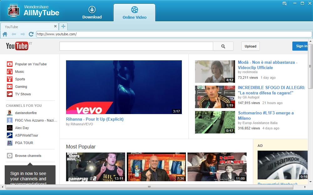 ![]() AllMyTube per WindowsAllMyTube rappresenta uno dei migliori tool per scaricare video online, ad esempio dal popolare Youtube e allo stesso tempo convertire i video scaricati nel formato che desideriamo. Possiede un set completo di funzioni per scaricare video da Youtube (e da altri siti di video sharing) per poi creare un archivio di filmati o convertirli in formato compatibile con dispositivi mobili come iPhone, iPad, iPod, PSP, Zune, cellulari Android, ecc… AllMyTube riesce a rilevare automaticamente il video presente nella pagina web e fa apparire un pulsante “Download” premendo il quale avviene lo scaricamento del file sul computer. Oltre a Youtube, questa applicazione consente di scaricare con un solo click, video da qualsiasi sito di video sharing come ad esempio Hulu, VEVO, Facebook, Metacafe, Dailymotion, Vimeo, Video Mediaset, ecc… Supporta Windows 11/10/8 / 7 / XP / Vista Continua a leggere |
